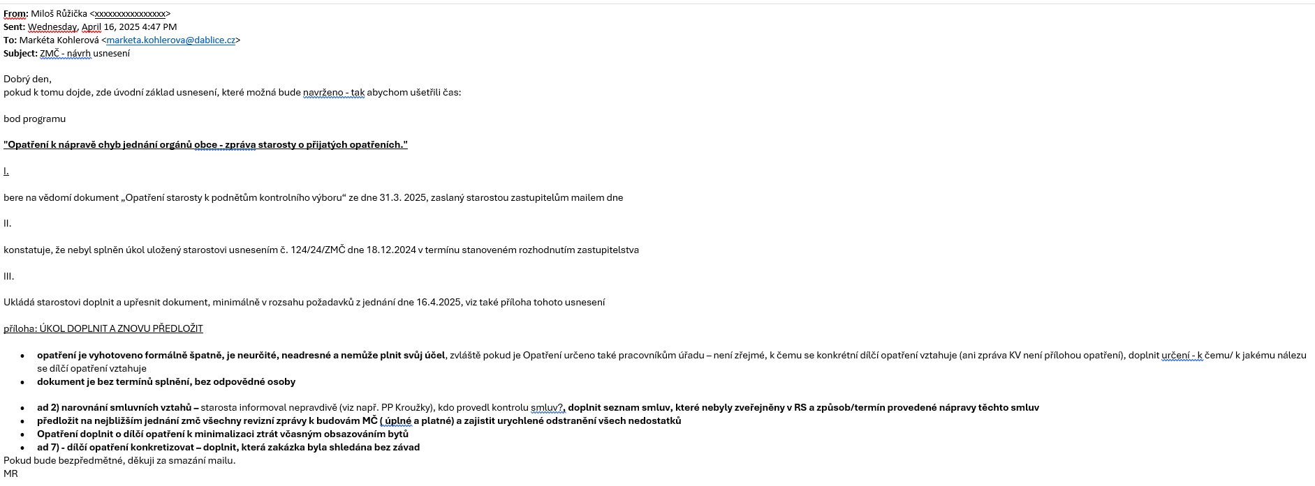 | 09-Opatření k nápravě chyb jednání orgánů obce – zpráva starosty o přijatých opatřeních | zastupitel M. Růžička | Návrh usnesení M. Růžičky | Schváleno | 141 25 Usnesení - Opatření k nápravě chyb jednání orgánů obce – zpráva starosty o přijatých opatřeních | stáhnout vše |